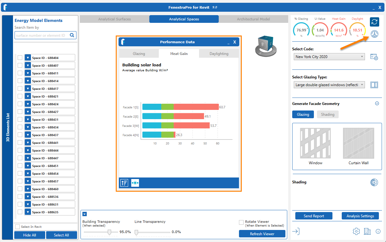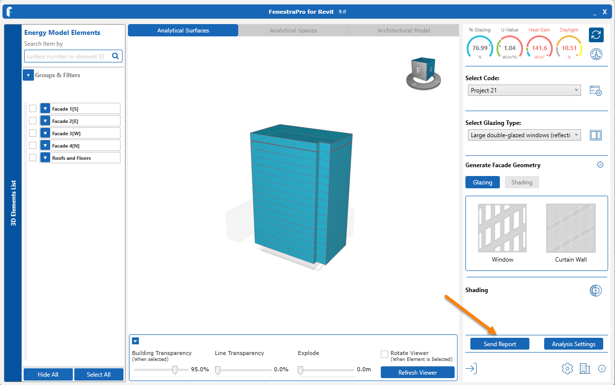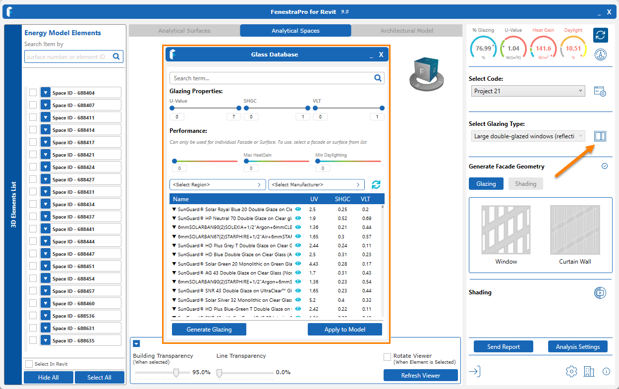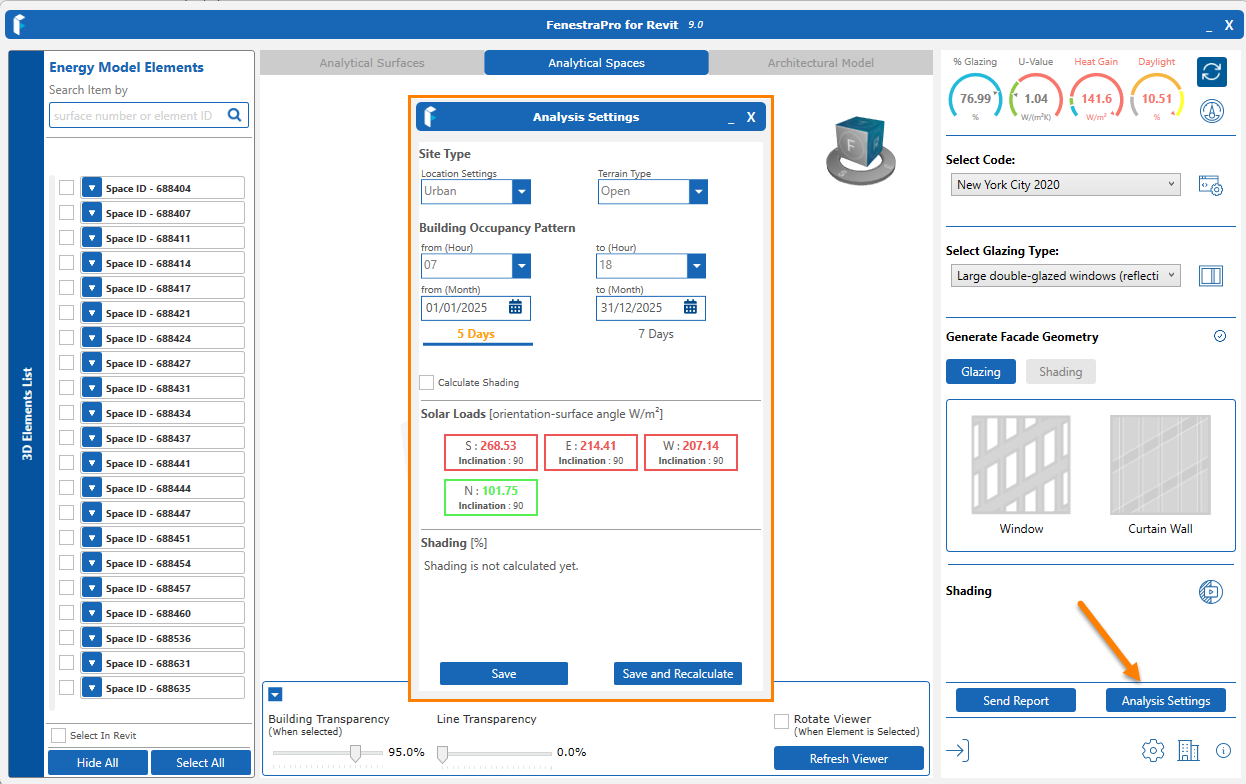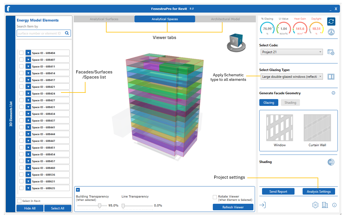 This option will apply a selected schematic type to all glazed elements in the model to compare results. Usin this will uncheck ‘Detailed Elements‘ in Revit’s Energy Settings so that the schematic type will override any analytical properties for glass elements. You may revert to detailed elements by going to Revit’s Energy Settings and checking again this setting and using the Refresh button in the application.