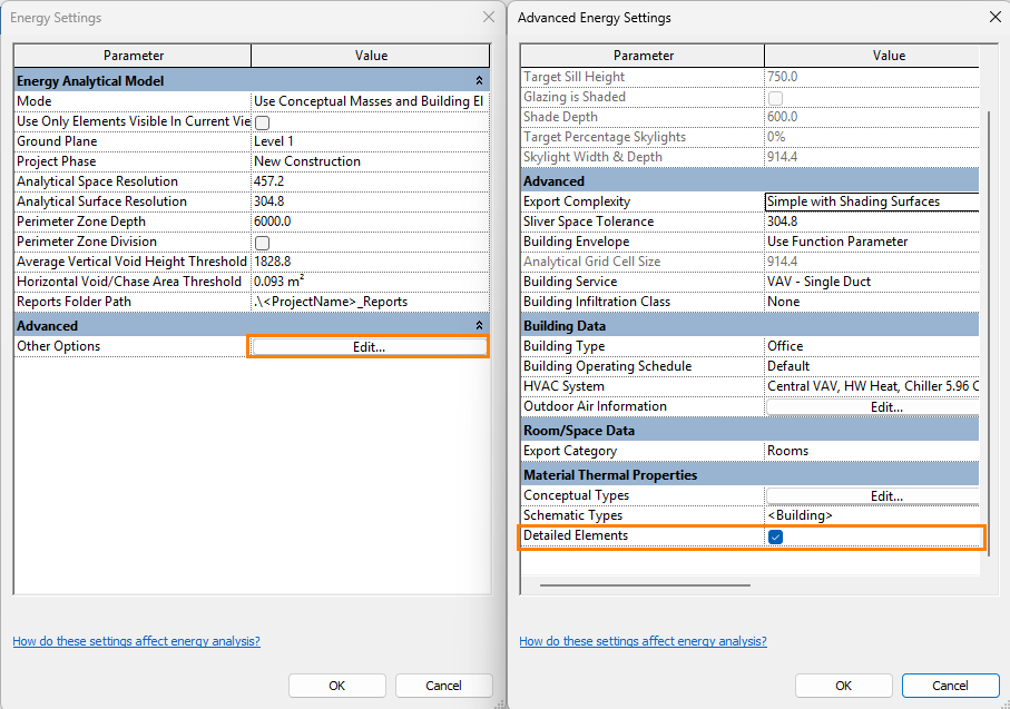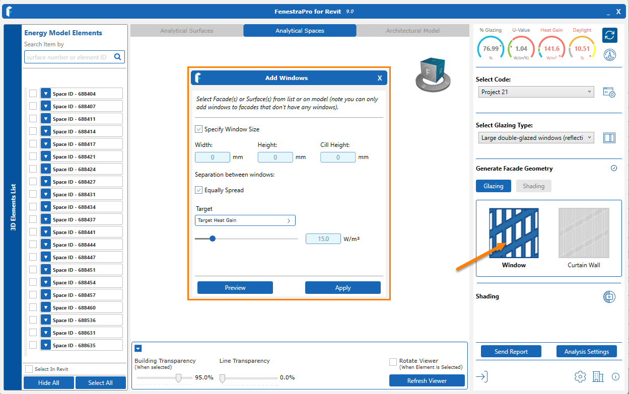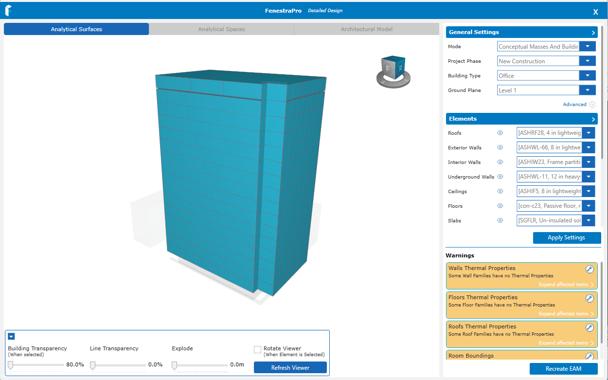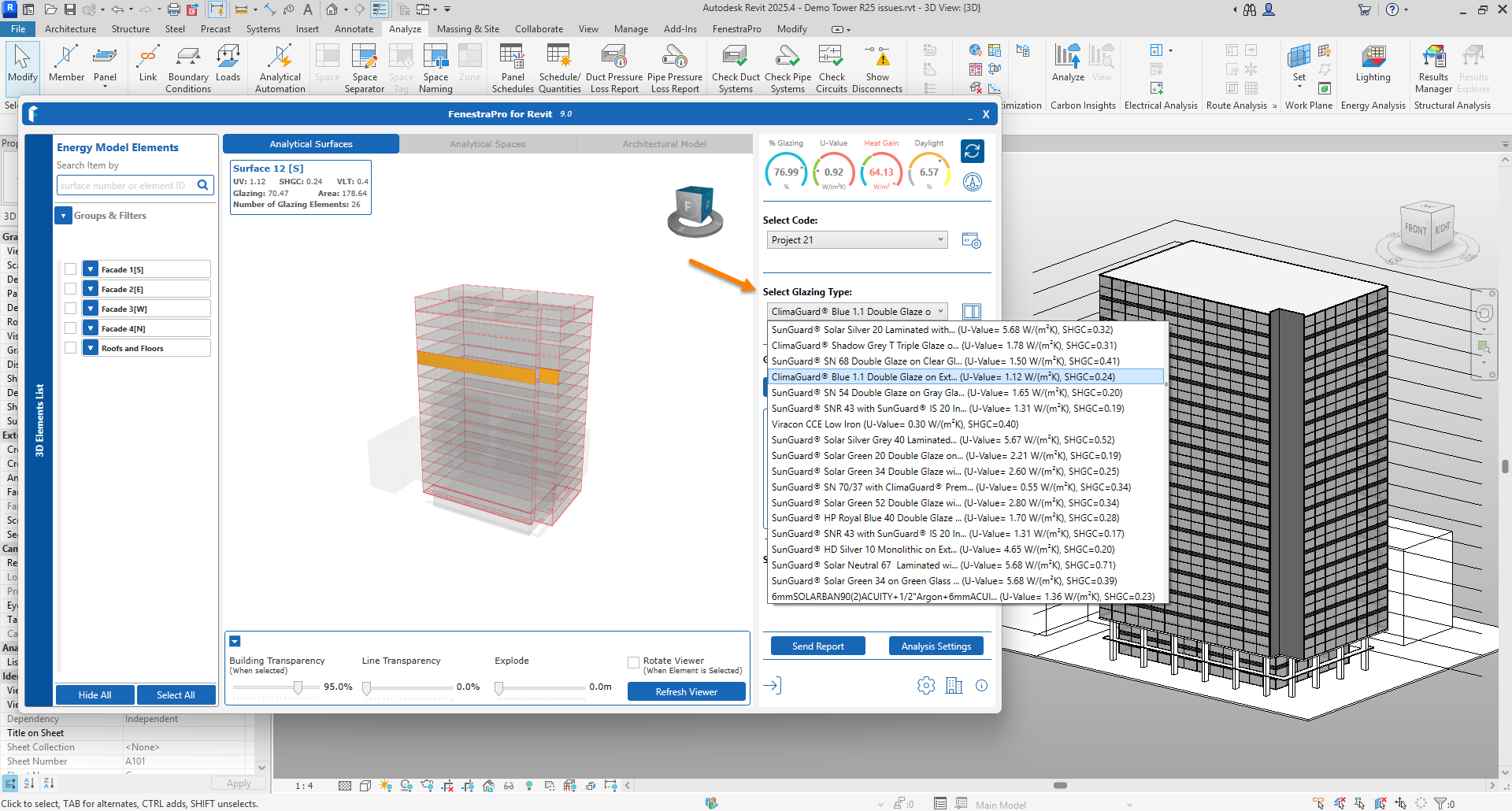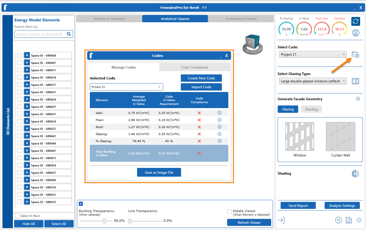 This option will apply a selected schematic type to all glazed elements in the model to compare results. Usin this will uncheck ‘Detailed Elements‘ in Revit’s Energy Settings so that the schematic type will override any analytical properties for glass elements. You may revert to detailed elements by going to Revit’s Energy Settings and checking again this setting and using the Refresh button in the application.