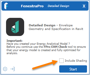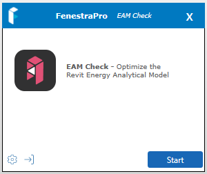 This is the main application for model analysis. When you click this on the Revit menu, a window will display before you proceed. There is an option to include shading calculations if you wish. This will take more time but is recommended if you have signifcant shading factors in your project (surrounding buildings, self-shading or shade devices). There are also options to log out or to open application settings. There is an advisory message to use the EAM Check tool first.